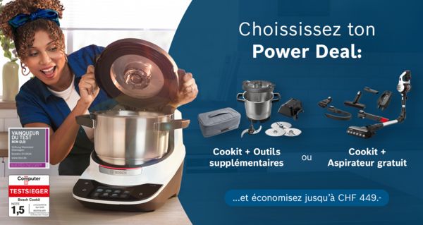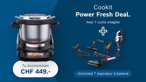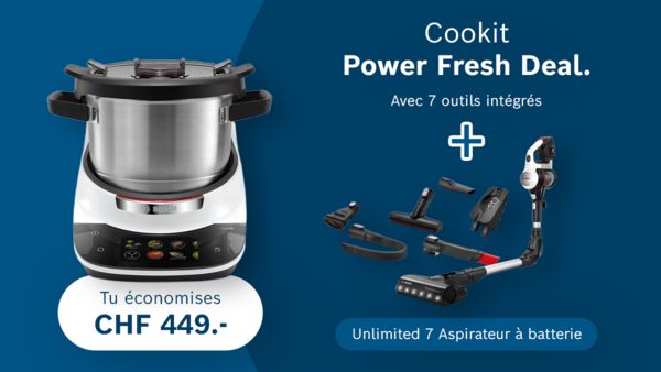 • Cookit Power Fresh Deal : Adopte le Cookit et reçois en plus un aspirateur sans fil Unlimited 7 d’une valeur de CHF 449.- offert – deux alliés qui rendent la cuisine et le ménage encore plus simples.