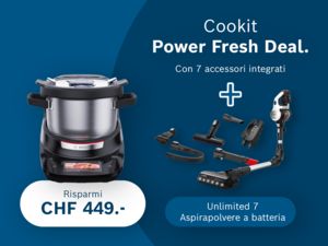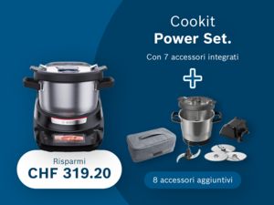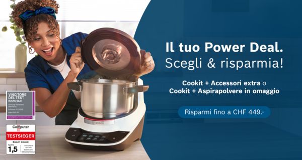 1L’offerta „Cookit Power Set“ è valida nel periodo promozionale dal 26.01.2026 al 22.03.2026 e comprende i seguenti accessori: Pentola XL Cookit (MCCA1BO), Coperchio Cookit (MCCA1LI), Disco SuperCut (MUZ9SC1), Disco per verdure asiatiche (MUZ9AG1), Disco per grattugiare fine (MUZ9FG1), Dispositivo di decantazione Cookit (MCCA1PA), Coltello Crush (MCCA1CK), Borsa per accessori Cookit (MCCA1TB). L’offerta „Cookit Power Fresh Deal“ è valida nel periodo promozionale dal 26.01.2026 al 22.03.2026 e comprende il seguente regalo: Aspirapolvere a batteria Unlimited 7 (BCS711XXL). Le offerte non sono cumulabili con altre promozioni (buoni, sconti o simili). Consegna fino a esaurimento scorte.