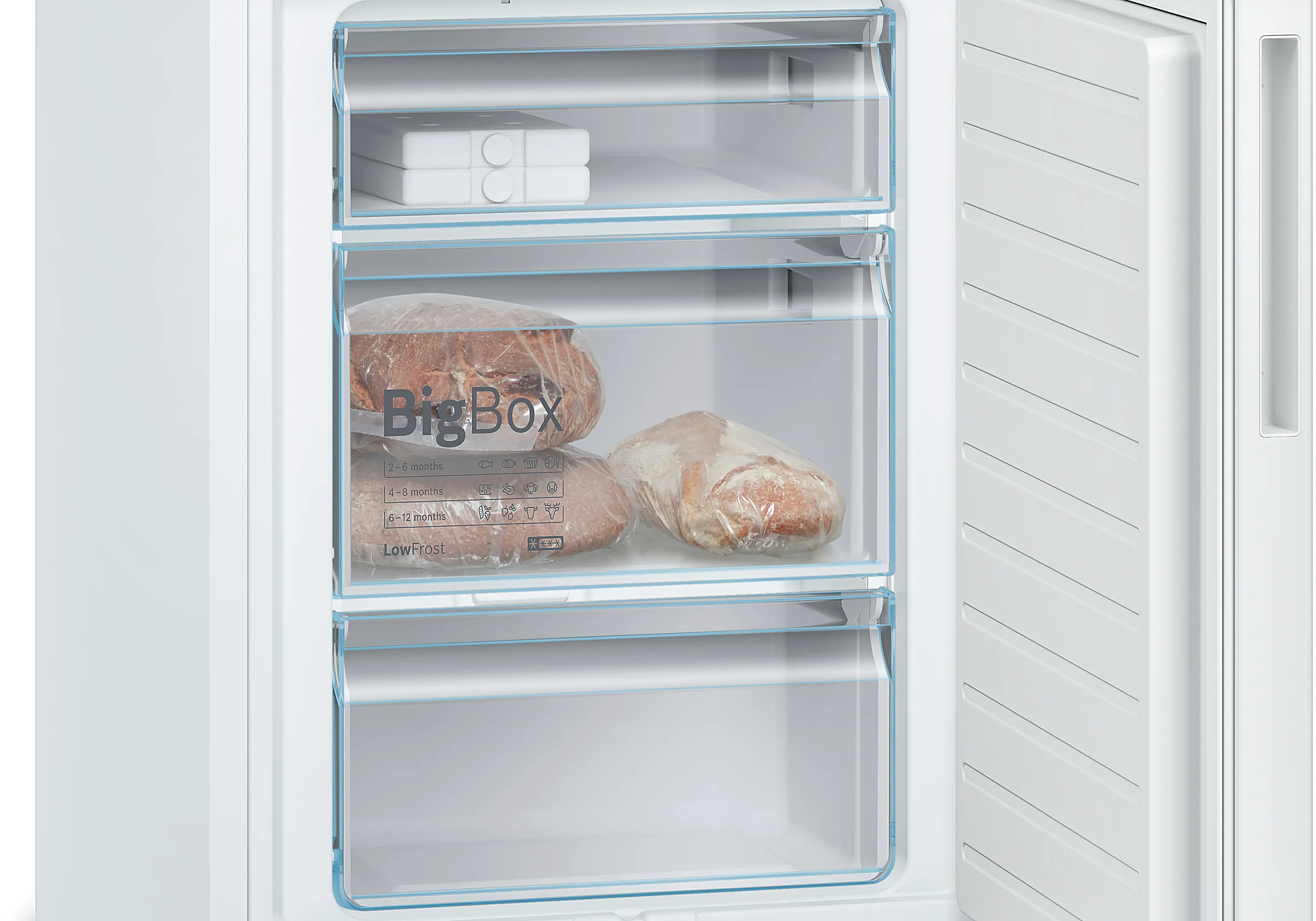 Zásuvka Big Box: pro stohování skladovacích nádob nebo pro velké zmrazené potraviny.