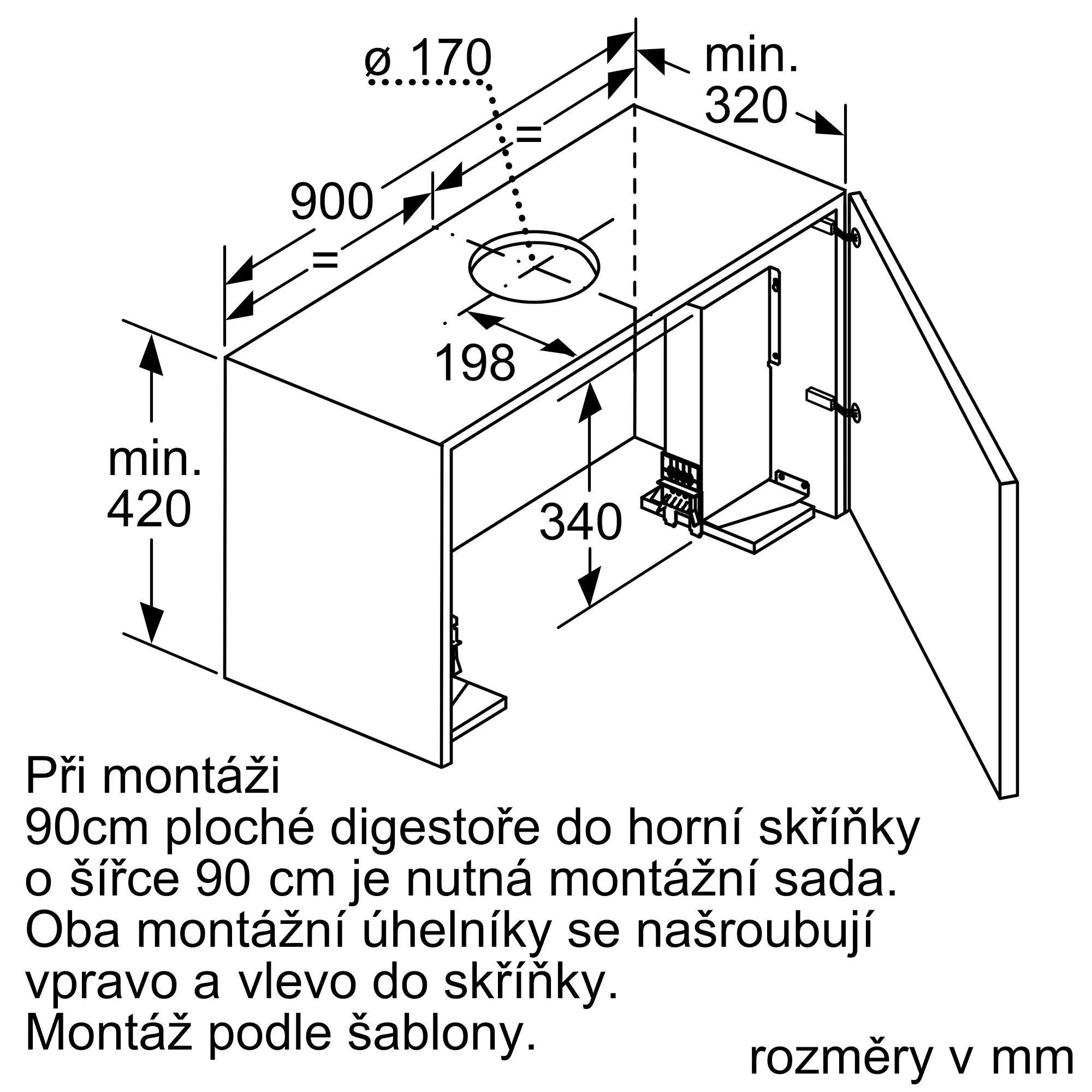 pro montáž 90cm-plochého výsuvného odsavače par do horní skříňky o š. 90 cm