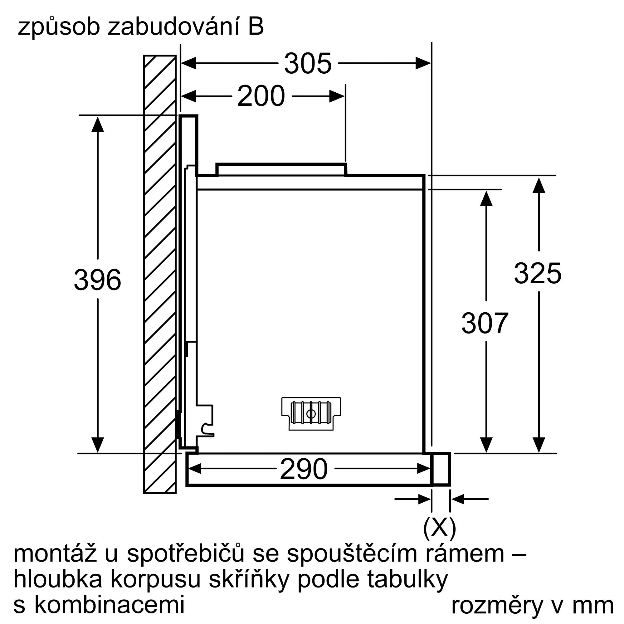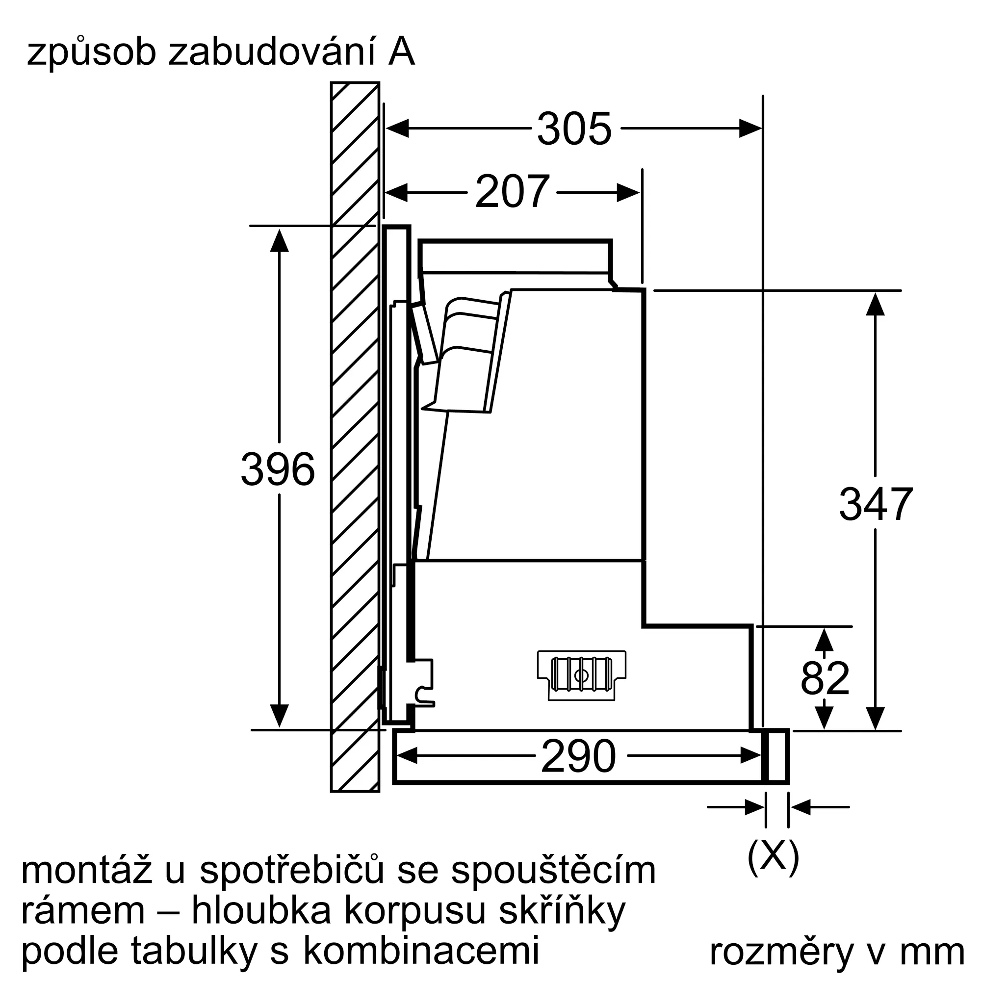 použitím snižovacího rámečku lze vestavný odsavač zcela zasunout do horní skříňky