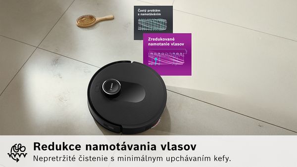 Funkcia zníženého namotávania vlasov zaisťuje hladké čistenie bez prerušenia – zabraňuje zamotaniu vlasov a nečistôt v kefke a minimalizuje upchávanie vysávania. Zároveň zvyšuje účinnosť vysávania – vlasy sú nasávané priamo do nádoby na prach namiesto toho, aby zostali na podlahe alebo v kefe.