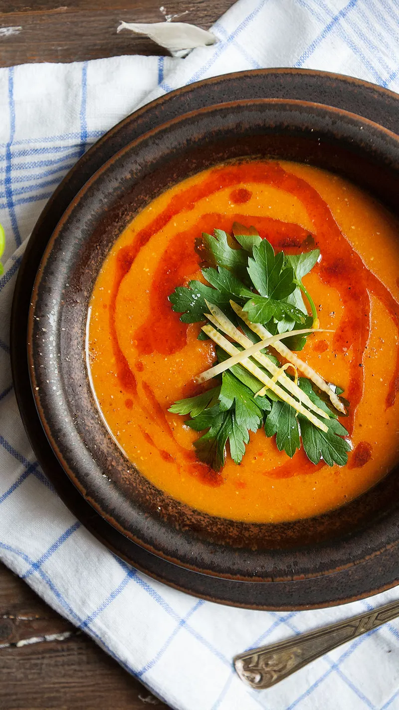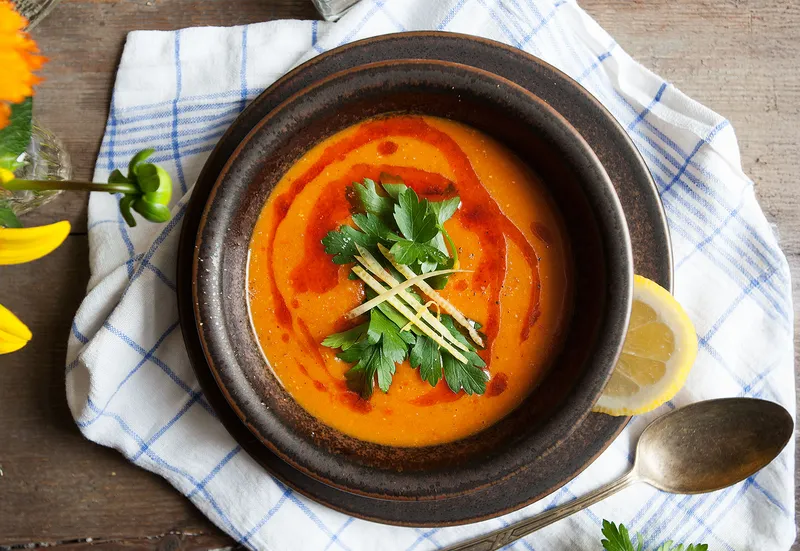 Blend soup until smooth with a hand blender. Add salt, pepper, and lemon juice to taste. Serve with fresh parsley, lemon zest, and a drizzle of the butter-paprika mixture. Enjoy!
