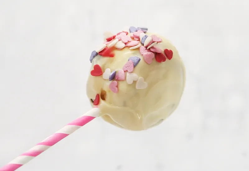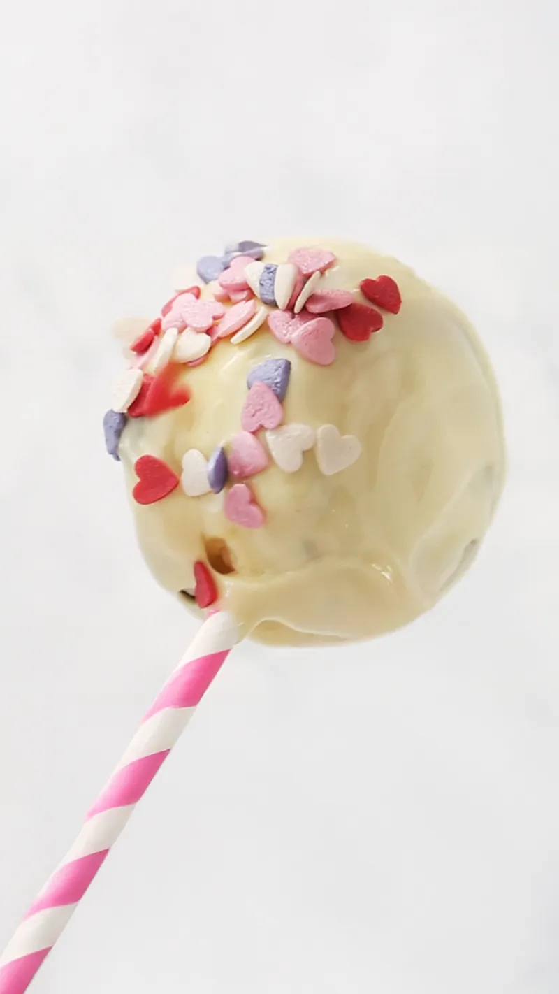 A hand decorating a white chocolate-covered cake pop with colorful heart-shaped sprinkles.
