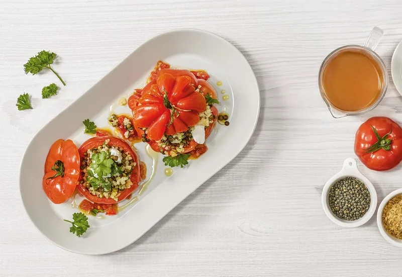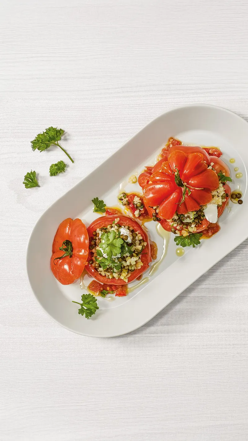 Stuffed tomatoes with lentils, bulgur wheat and goat cheese