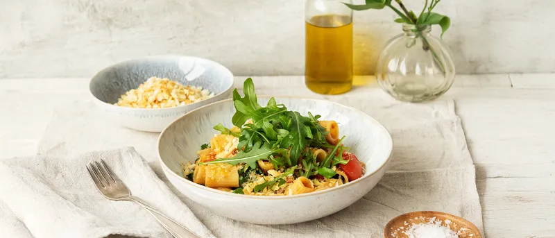 Add the pasta directly to the pan with the bacon and tomatoes, placing the pan over medium-high heat. Then add pasta water and toss together. Add arugula and keep tossing to form a glossy sauce. Serve immediately, topped with grated Pecorino Romano cheese, toasted panko, and a drizzle of olive oil. Enjoy!