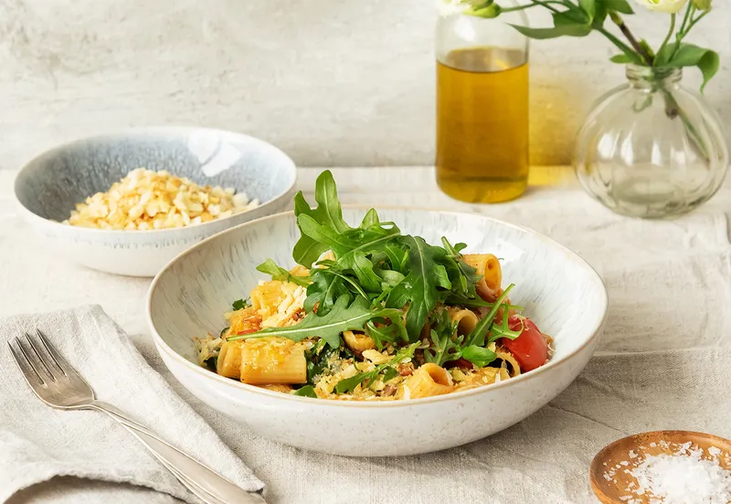 Ingredients: 8 oz smoked bacon | 3 lbs mixed tomatoes | 21 oz rigatoni