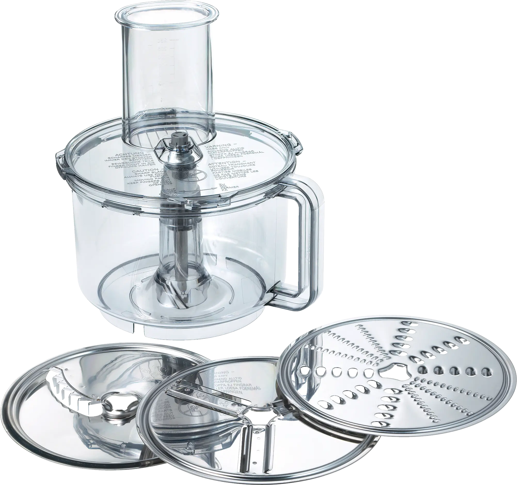 Reversible slicing disk (thick and thin), reversible shredding disc (coarse + fine) and french fries disc